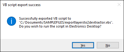 - Export to 2D Extractor – generates a VB script to export the selected layer’s cross-section to 2D Extractor. Generating this script launches a prompt asking if you want to run the script in Electronics Desktop.