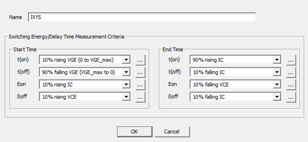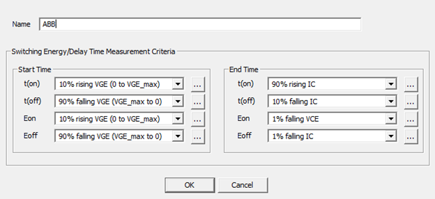 The on-switching energy loss, Eon, is measured as starting at 10% after zero-crossing of rising VGE and stopping at 10 to 20 microseconds beyond this point. The off-switching energy loss, Eoff, is defined as starting at 90% of falling VGE and stopping at stopping at 10 to 20 microseconds beyond this point. Due to limitations of the device characterization tool, the following settings provide an approximation of these energy parameters: Ansys suggests the following on-switch energy settings: