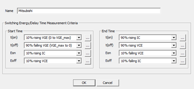 Mitsubishi uses varying definitions for its switching criteria. The datasheets usually supply the definitions that were used. Regrettably, many datasheets do not supply the values of Eon and Eoff, so it will not be possible to fit for these characteristics. Consequently, you need not fit for these values in the Dynamic Model Input section. Ansys suggests the following on-time settings: