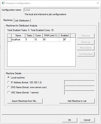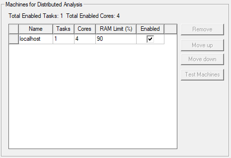 The Machines for Distributed Analysis area lists machines in the order in which you entered them, irrespective of the load on the machines. To control the list order, select one or more machines, and click Move up and Move down. To remove one or more machines, select the machines and click Remove.