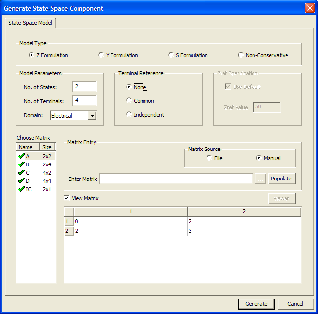 This list contains all the matrices whose values need to be specified to generate the model. You must specify at least the A, B, and C matrices to enable the Generate button for component generation. Check marks next to each matrix name indicate if the matrix has been populated or accepted. Sizes of matrices are calculated based on the model parameters. After you select a matrix in the list, use the Matrix Entry fields to specify the matrix source and to populate it. When you select the View Matrix check box, a spreadsheet-style table lets you view and edit the matrix entries.