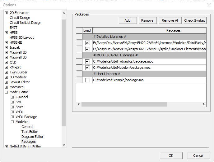 - Select Packages to load installed libraries, MODELICAPATH libraries, and user libraries. Only packages selected to load appear in the package browser.