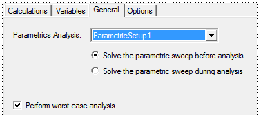 Select Perform worst case analysis to calculate first derivatives for each variable. If you have three variables and for Var1 the first derivative is negative, for Var2 the first derivative is positive, and for Var3 the first derivative is positive, then for Worst Case Analysis, you should request two more variations: