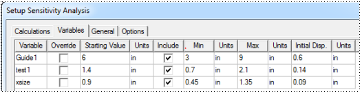 Create a new analysis under Optimetrics Analysis > Add Sensitivity, and include variables in a sensitivity analysis. To do so, go to your list of variables, specify Min and Max values of each variable, and select Include. The following figure shows an example with three variables included: