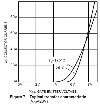 In the Transfer Characteristics dialog box, each tab corresponds to one transfer characteristic curve, that is, Ic=f(Vge) at a specific temperature. These characteristics are obtained from the typical transfer characteristic curves supplied by the manufacturer as shown in the following example.