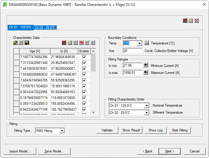 In some cases, data sheets provide graphs for the transfer characteristic that far exceed the regular range of working conditions of the IGBT. This has a negative influence on the quality of the curve fitting by making the fitting process to focus on the high current area. Therefore, the data points used for the fitting of the transfer characteristic should be limited to approximately three times INOM.
