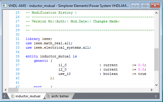 The VHDL-AMS editor window displays entity and architecture declarations for the current VHDL-AMS Model project. Click the tabs at the bottom of the window to select an entity or architecture declaration for editing.