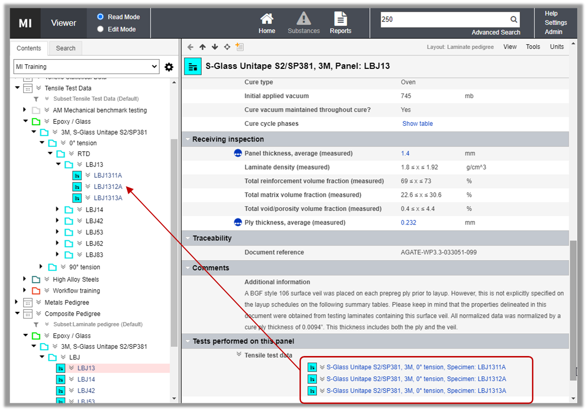 Record datasheets may include links to related records in other database Tables, such as related test records, producer records, or process records.
