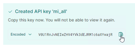 { "mi_all": { "cluster": [ "monitor", "manage_pipeline" ], "indices": [ { "names": [ "mi_*", "is_*", "isdb_*", "al_*" ], "privileges": [ "all" ] } ] } } - Click Create API Key.