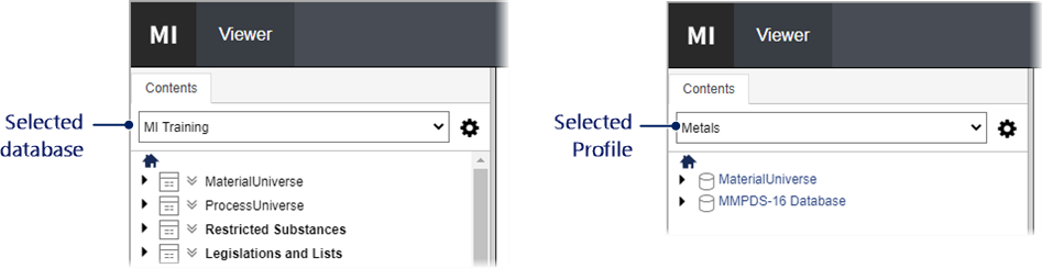 The selected database or Profile determines which Tables, folders, Records, and Subsets are shown in the Contents tree, and also defines the scope of any searches performed in MI Viewer.