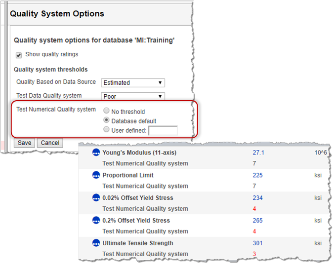 In this example, the Test Numerical Quality system threshold is set to the database default value, which is 4 in the MI Training database. When quality ratings are visible, ratings of 4 or less are shown in red: