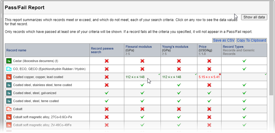 A tick indicates a 'Pass' for that criteria, a cross indicates a Fail. You can click any row to see the data values for that record. For example: