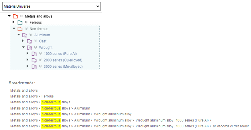 For example, the records/folders identified below will all appear in the Pass/Fail Report for a search query that includes the search term "non-ferrous", even when the search term does not appear anywhere in the record/folder name or in the record data, or when the search criteria specifies that only records and not folders should be returned by the search, because the search term occurs in the path: