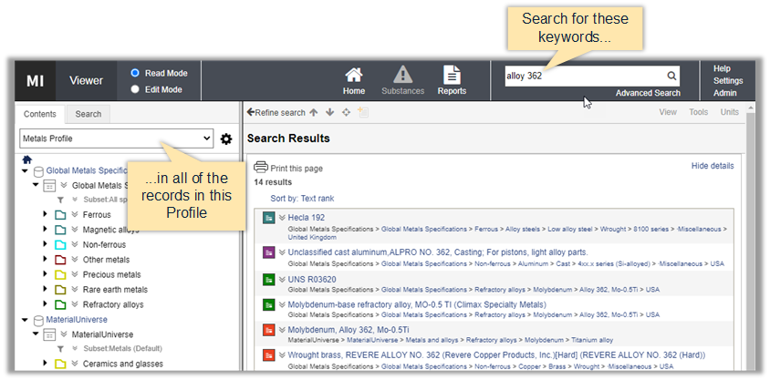 • The Profile or database that is currently selected can affect the number of records returned. For example, with a Metals Profile selected, searching for the keyword aluminum will produce many results, while searching for the same keyword when a Plastics Profile is selected will return only a few results.
