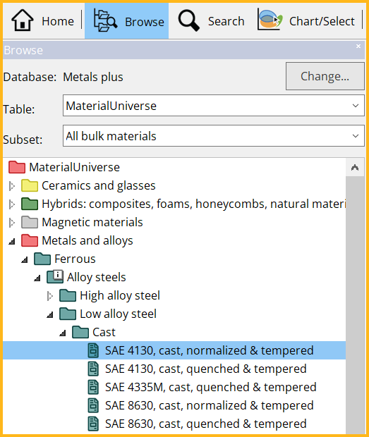 The Browse tree allows you to explore the database, drilling down into the database record hierarchy. Records in the database are presented in a hierarchical tree structure, table by table. At the top level of the tree are the main ‘families’ of materials. At the lowest level are specific materials. In the MaterialUniverse table (shown left), material records are organized into four broad ‘families’: ceramics and glasses, hybrid materials, metals and alloys, and polymers. Each family is made up of ‘classes’ (Ferrous, Precious metal alloys, for example) which may contain ‘sub-classes’ (Alloy steels, Low alloy steel, Cast) consisting of many ‘members’ (SAE 4130, for example). The categories and hierarchy presented in the Browse tree are specific to each data table: for example, in ProcessUniverse, the records contain process data rather than material data, and are organized by process type: Joining, Shaping, or Surface treatment. |