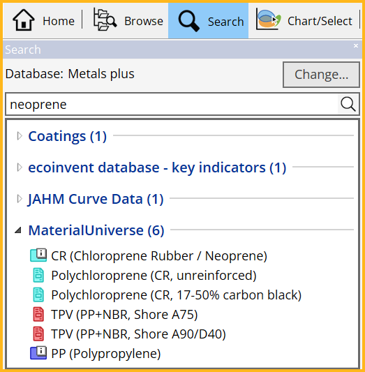 You can find materials or processing methods using a simple keyword search. Double-click a record in the Search results list to open its datasheet. The search term will be highlighted wherever it appears. You can also perform more advanced queries here, for example, using AND, OR and NOT, or searching for phrases ("steel alloy"). |