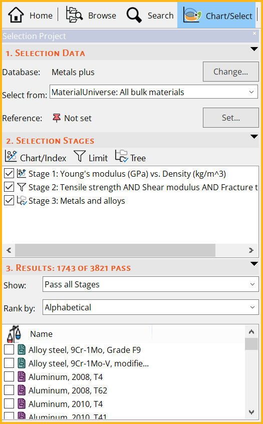 There are three main tools in Granta Selector: Browse, Search, and Chart/Select.