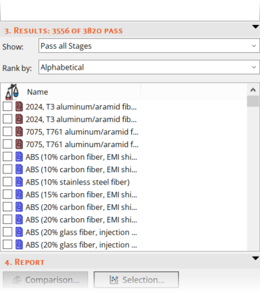 After creating selection stages, you can review which materials have passed all, or some, of the selection stages. The results list can be ranked to allow easier navigation and selection of records.