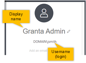 Option Description Display name Your display name is used to identify you within MI User Manager. All users can change their own Display name. Username The username you use to log into Granta MI with. You need to be an MI Data Administrator to edit usernames. Email address The Email Address field is not used in systems with Windows Authentication (where you log in to Granta MI with your Windows Active Directory credentials).