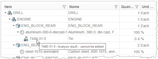 For example: In the analyzed BoM below (for a Restricted Substances analysis), you cannot edit the substance '7440-31-5' because it represents a substance that has been found by the analysis to be present in the material 'aluminum-380-0-diecast-f'. However, you can edit the material 'aluminum-380-0-diecast-f' and the part 'ENG_BLOCK_REAR', because these were both specified in the original BoM.
