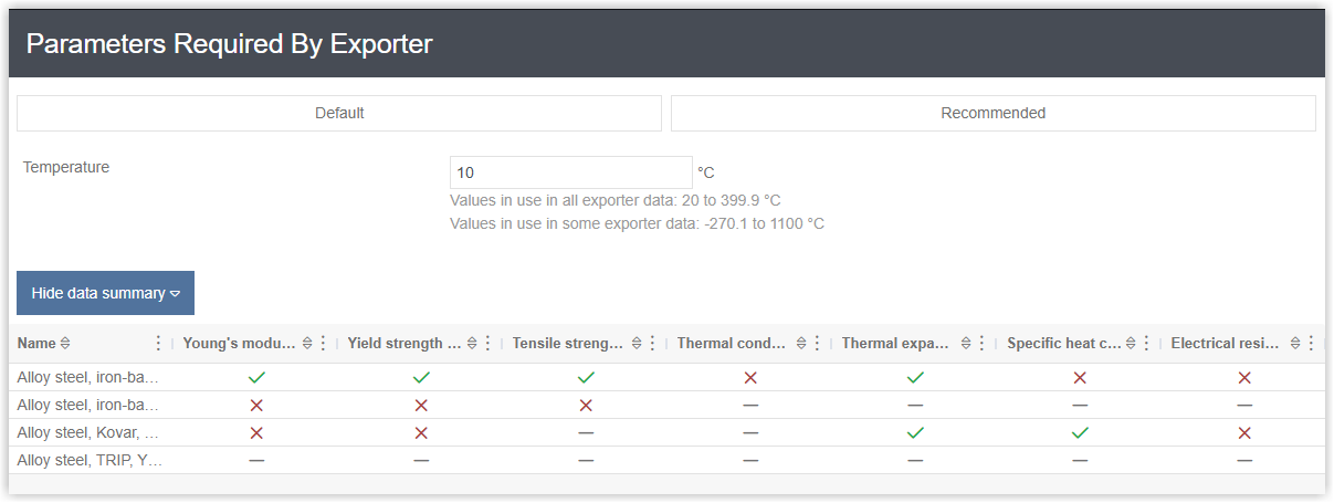 You can export material card information for use in CAD, CAE, or PLM applications from