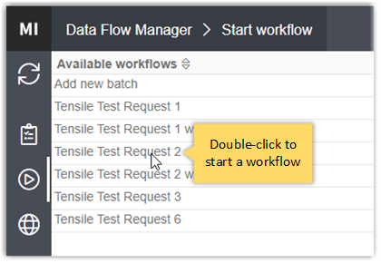 The Start Workflow page lists all available workflows. Double-click a workflow on this page to start a new instance of that workflow.