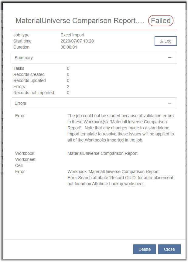Where errors occurred, these are summarized here. For Excel files, the workbook, worksheet and cell where the problem originates is identified, where possible, to help troubleshooting, for example: