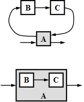 In the example below, while Component A is running, it causes Components B and C to run multiple times. This can be viewed either as Component A calls Components B and C as subroutines or as Component A encompasses Components B and C.