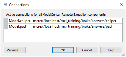 The Connections dialog is a way to view all components that are connected to ModelCenter Remote Execution (MCRE) and edit other connections that currently exist between components. Most complex workflows in ModelCenter will use MCRE or will connect to other MCRE folders on other computers. This dialog provides a condensed and centralized way to manage all of the components that require connections to MCRE.