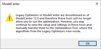 The Legacy DOT Optimization Tool can no longer be used to run trade studies. The trade study tool is still available so that legacy trade studies can be viewed in order to manually transfer the setup and options to the Optimization Tool, which is where the optimizer algorithm now reside.