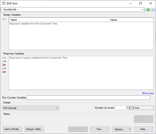 The Design of Experiments (DOE) Tool simplifies the purposeful changing of inputs (design variables) in a workflow to observe the corresponding changes in outputs (response variables). A set of valid values for each design variable constitutes a design point. This tool is used to collect the responses in the workflow to a set of predetermined design points. Tools are provided to graphically set up and conduct this experiment.