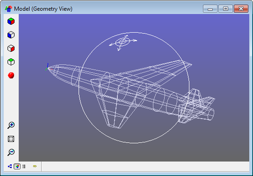 Rotate - Hold down the left mouse button while in the Geometry View, and a "trackball" appears. When the cursor is inside the trackball, the view will rotate as if you were rolling the trackball in the direction you drag the mouse. When outside the trackball, the view will spin clockwise or counterclockwise as you drag the mouse.