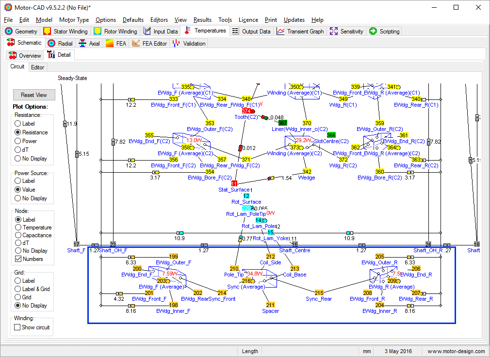 The calculated steady-state temperatures, resistances and power flow can be viewed in the Schematic or Output Data [Numerical Values]. The transient performance can also be calculated and viewed.