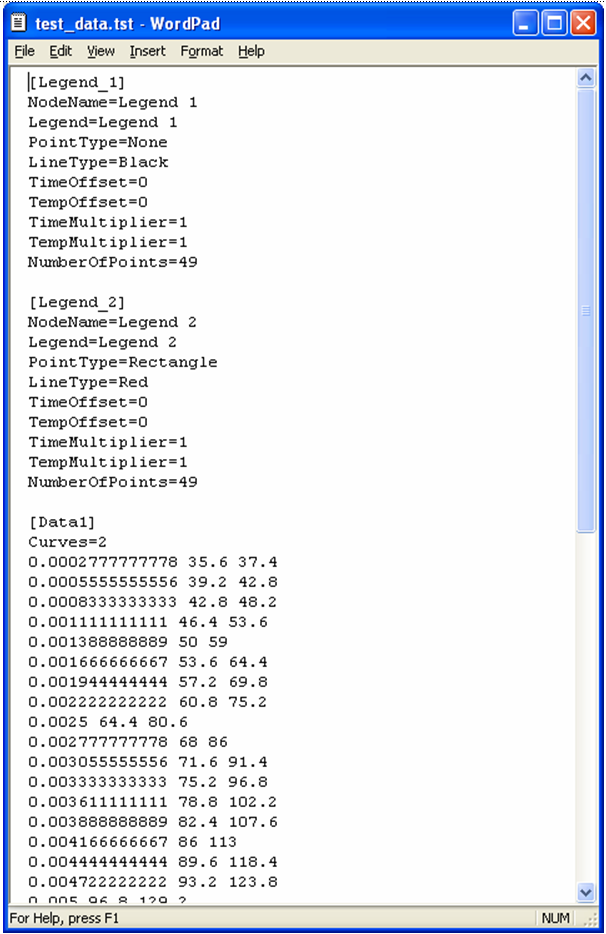 The user can load external test data in either the .dat format with no plot settings or in the .tst format which includes plot settings as shown below.