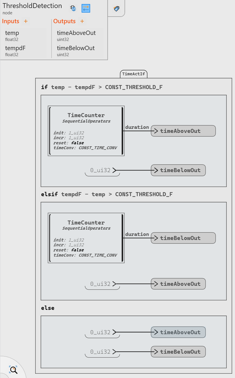 - timeAboveOut, a time during which the difference between the indoor and outdoor temperatures is greater than a threshold. To count this time, you only want to activate a counter when this difference is above the threshold. This time is computed by the TimeCounter operator introduced in the 2. Add Memory chapter.
