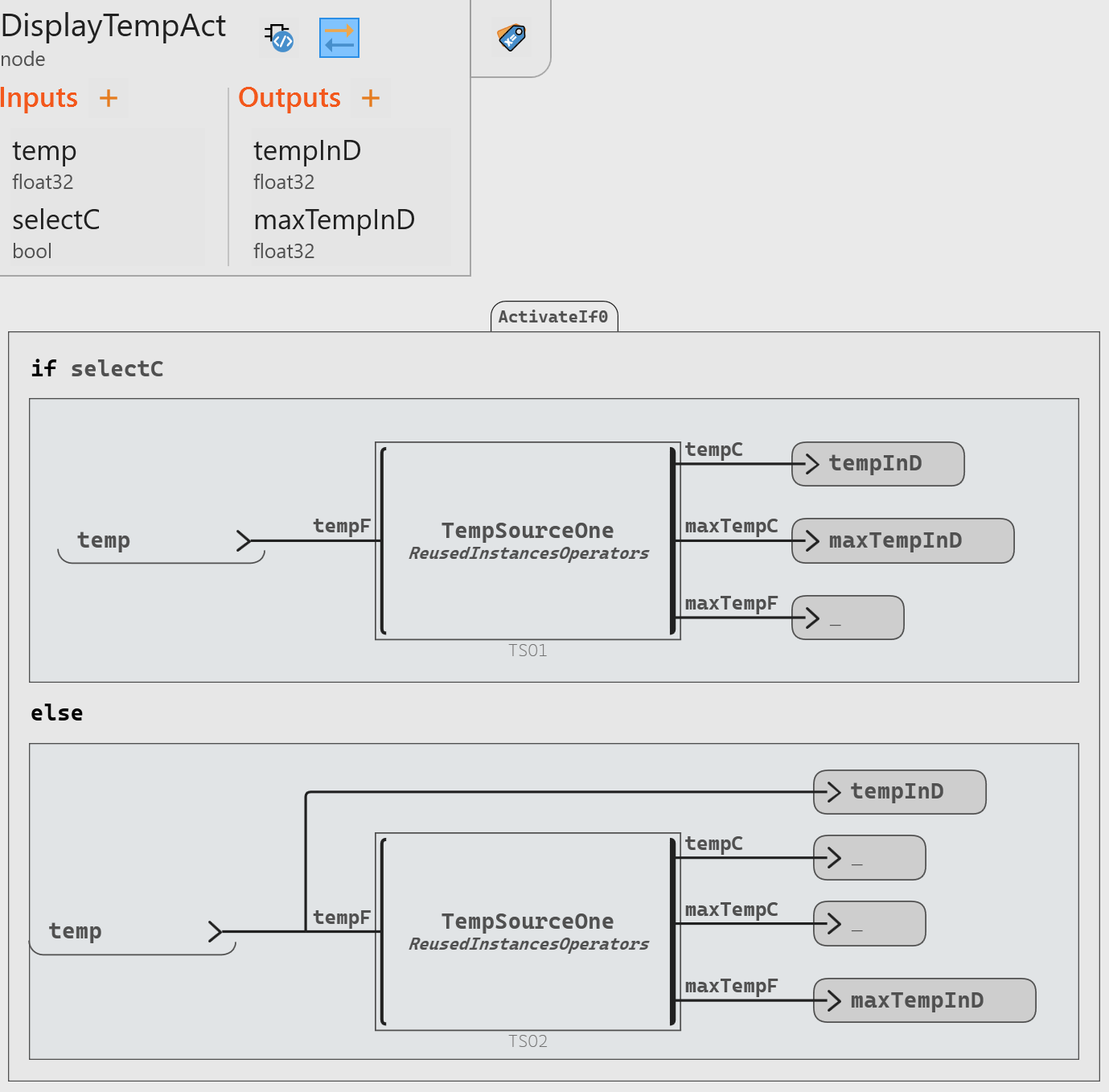 A Swan model must be complete, hence the output flows from an operator instance are connected by wires to a terminator _ when they are not connected to outputs of the root operator as above: for example, tempC is not produced and so connected to _ in the else branch.