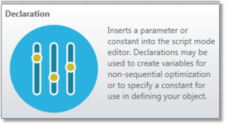 宣言コマンドは、ある数値をスクリプトの他の場所でも使用できるように定義するときに使用します。値の参照には宣言した値の名前を使用します。宣言には、パラメータと定数の 2 種類があります。パラメータと定数が異なる点は、パラメータが OpticStudio のユーザー インターフェイスに公開されることです。ノンシーケンシャル コンポーネント エディタを使用して、スクリプトに定義された値を別の値で上書きできます。