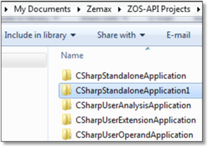 各オプションをクリックすることで、Ansys Zemax OpticStudio によって次の図に示すフォルダが生成されています。それぞれのフォルダには類似した名前の Visual Studio ソリューションが格納されています。