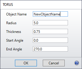 円形のトーラス体積を作成します。半径 r の円を、YZ 平面の +Z 軸上、距離 R の位置に置きます。角度 0 は円のこの位置に対応します。この円を +Y 軸を中心に start_angle から stop_angle まで回転させて、トーラスを作成します。start_angle と stop_angle は度 (°) 単位で測定し、-360 ~ + 360 の範囲になければなりません。