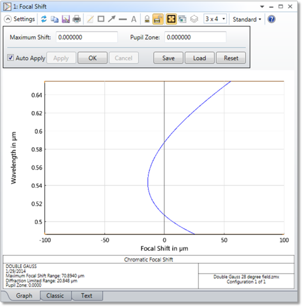 The maximum shift setting overrides the default scaling. Units are in lens units. The entire plot is always referenced to the primary wavelength paraxial focus. The diffraction limited depth of focus listed is given by the formula 4λF2, where F is the working F/# and λ is the primary wavelength