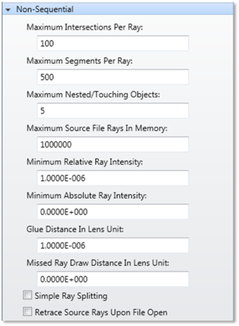 These Non-sequential features are available in the System Explorer. The controls in this section define how rays trace within a NSC group.