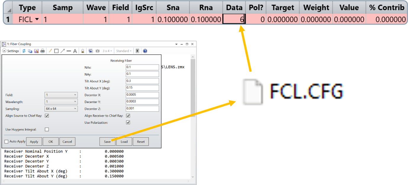A The FICL merit function operand now supports all settings available in the user interface for the Single Mode Coupling analysis. To utilize this new feature, first define your settings in the Single Mode Coupling analysis and click "Save" in the settings box to create (or update) the configuration (CFG) file. In the merit function, set the Data parameter for the FICL operand to a value between 6–11 (instead of 0–5) to apply the settings from the CFG file. For more information, please refer to the Help file.