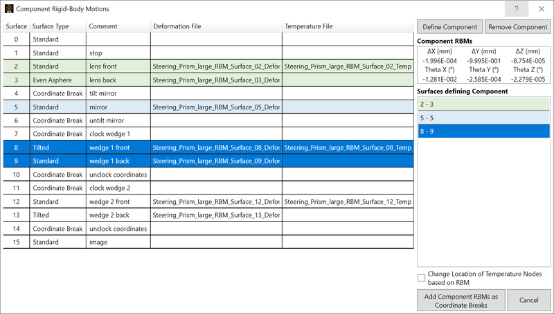 点击定义元件(Define Component)。STAR将计算所选表面的平均RBM,并将其显示在元件RBM表格中。一个条目将出现在表面定义元件(Surface Defining Component)列表中。