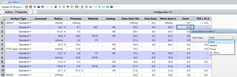 圆锥系数拾取求解使用其他表面所缩放的值和数据栏为目标表面的圆锥系数。另请参阅"求解限制(Solve restrictions)"。若要在ZPL宏中设置拾取求解,请参阅"列编号的整数代码(Integer codes for column numbers)"。