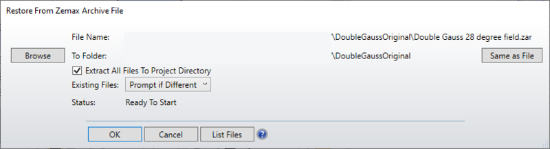 该功能加载先前创建的存档文件,并支持ZAR和ZPRJ存档格式。根据文件格式,OpticStudio将打开处理ZAR或ZPRJ的定制对话框。当选择该功能后,OpticStudio会提示您选择要恢复的文件。