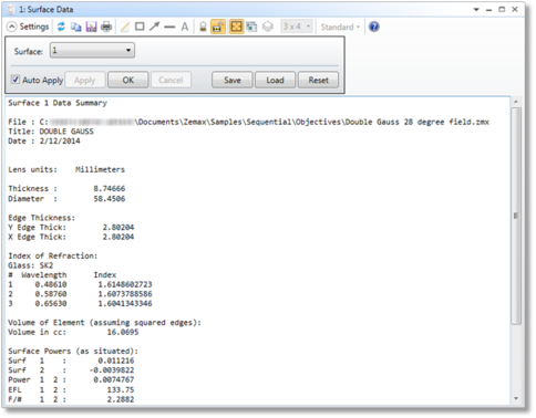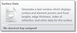此功能可生成一个文本窗口,显示表面的指定数据。数据包括表面和元件光焦度和焦距、边缘厚度、折射率以及其它表面数据。