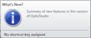 Contents 帮助选项卡(The Help Tab) » 文档选项卡(Documentation Group) » 新功能(What's New)Print page 新功能(What's New) 新功能(What's New)按钮位于帮助选项卡的资源(Resources)部分。 该窗口包含此版本OpticStudio中重点功能的概述。首次打开新版本的OpticStudio时,该窗口会自动打开。 下一部分: 实用工具选项卡(Utilities Group) « ZOS-API语法帮助(文档选项卡)(ZOS-API Syntax Help (documentation group))实用工具选项卡(Utilities Group) »
