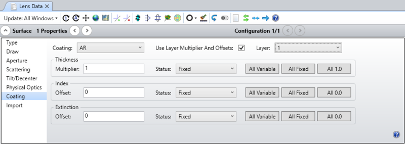 Use Layer Multipliers If unchecked, all coating layer multipliers are disabled for this surface. The coating thickness will be as defined by the coating data file. If checked, the coating multipliers are considered.
