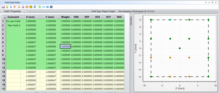 Field points whose rows are green in the editor are shown in the Field Plot as green points, and are the points that will be plotted whenever "First 12" is selected in an analysis or layout plot. Field points whose rows are yellow are shown in the Field Plot as yellow points.
