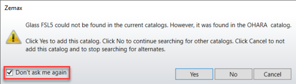 If you select 'Don't ask me again' and click 'Yes', then the next time you enter a name into the Material column of the Lens Data Editor of a material from a catalog that is not one of those listed under the "Catalogs To Use" section of the System Explorer, the catalog that does contain the material will automatically be added to the "Catalogs To Use" section of the System Explorer without any further input on your end.